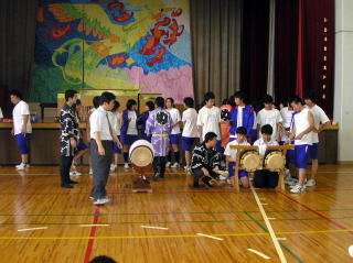 最初は照れてしまって見ているだけの生徒もいましたが、すぐに全員が楽器の周りに集まり、太鼓や鉦を叩くという初めての体験を楽しんでいました。