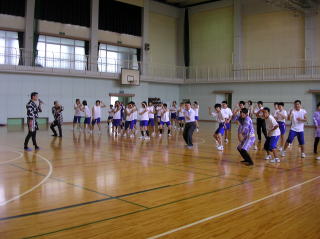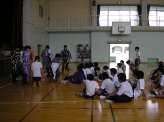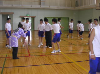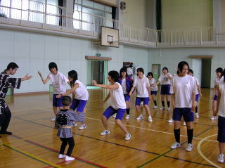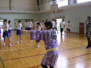 後半は踊りを体験してもらいました。ひょっとこの踊りでは、思うように動けずお互いの踊りを見て笑ったり、先生のおかしな動きに生徒が笑ったりする場面もありましたが、次第に全員の踊りがそろい始めたのには私たちも驚きました。