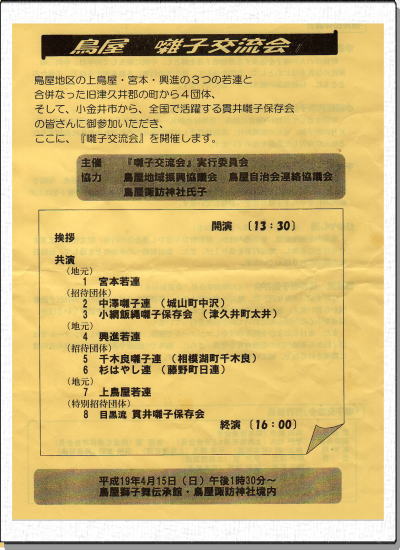 「囃子交流会」は、鳥屋地区の上鳥屋若連、宮本若連、興進若連の3若連と他地区の招待団体のお囃子の共演を通して、各団体のお囃子の技量を高め、若連活動の理解を深めるとともに、お囃子の伝統を守り、将来に継承するための一助として開催されました。