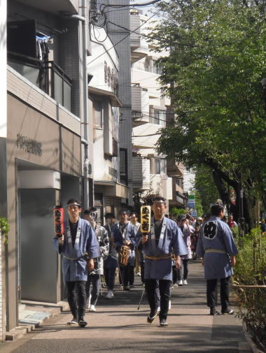 先頭に提灯、その後ろに金棒、おけど太鼓、御神輿と続きます。