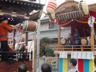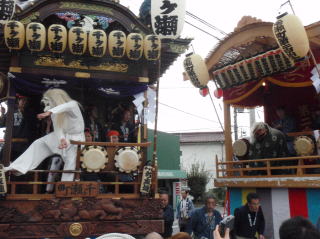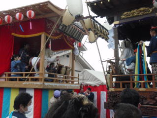 午後も、他の自治会との競り合い(せりあい:他の山車がきたとき、演奏を競い合っているように見えることからこう言われるようです)が続きました。