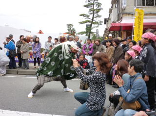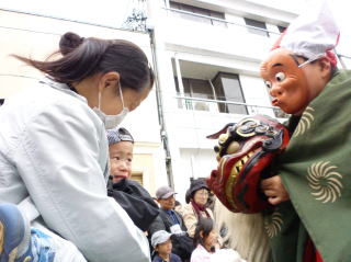 | 頭を噛んでもらおうとするお母さんとお獅子に怯えるお子さん。今にも泣きそうです(^^; |