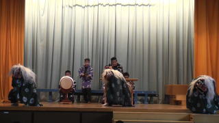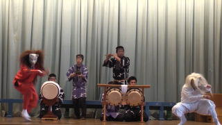演奏が始まり、獅子のときまでは大人しく見ていた子ども達も、ひょっとこが出てくると大喜び!握手したり、呼んだり、獅子で頭を噛んでほしいと頭を出したり、大騒ぎでした。最後の狐のときにまたひと盛り上がりして、10分間という短い時間でしたが、とても楽しんでくれたようでした。