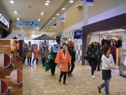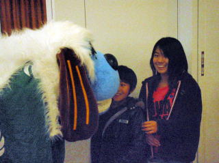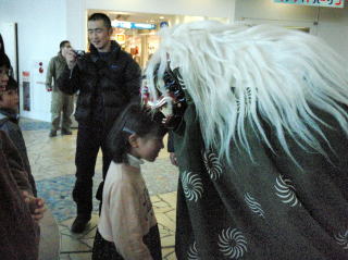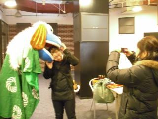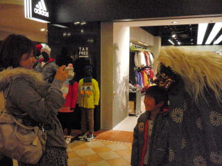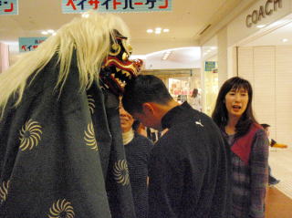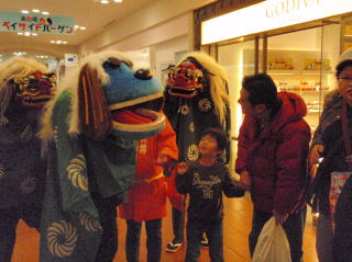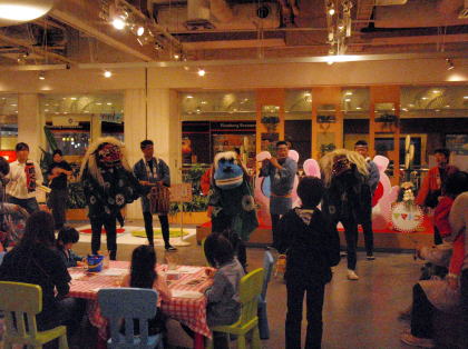 | 昨年に引き続き、今年もアクアシティお台場6階にあるキッズカフェママトコに出演してきました。ママトコでは、お正月企画として昔なつかしの遊び(スゴロクや福笑い)やコマ体験などが開催されていました。私たちは午後1時半と3時の2回、ママトコ内を獅子舞で廻ったあと、3階の出入り口付近や店内を練り歩きました。 |