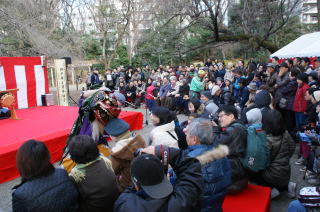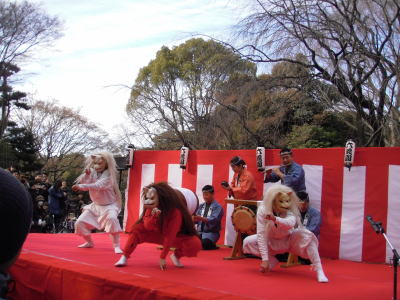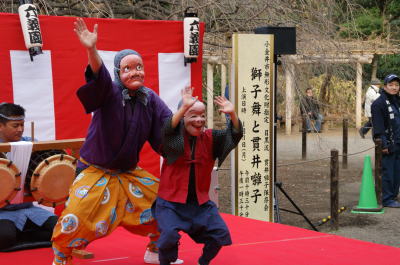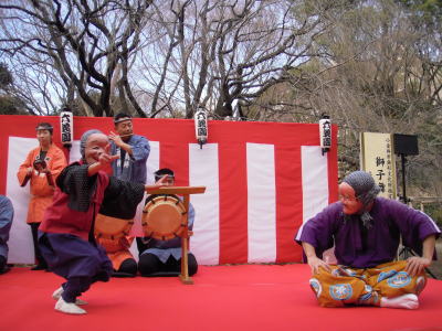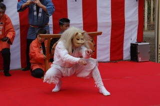 ひょっとこが登場して間もなく、数名が獅子を持って舞台下に降りていきました。