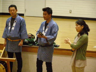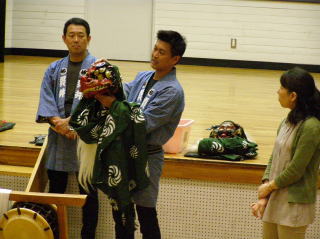 興味を持ってもらったところで、楽器、お面等の説明へと入りました。