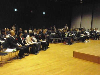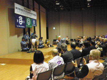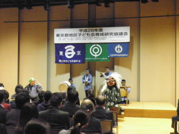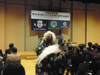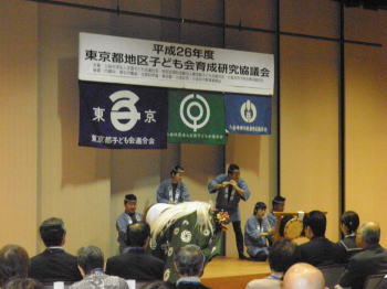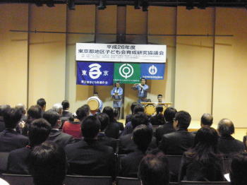 | 会場の様子 11月24日、小金井市民交流センターにて行われた東京都地区子ども会育成研究協議会に出演しました。 今回はアトラクションとしての出演でしたが、 演奏後には保存会会長による基調講演を依頼されておりました。 そのため講演の前に貫井囃子を見ていただき、 貫井囃子への理解をより深めてもらうという意味合いも含んだ演奏となりました。