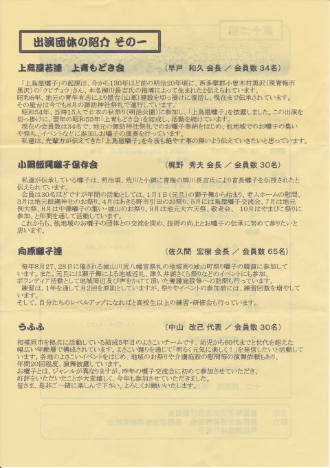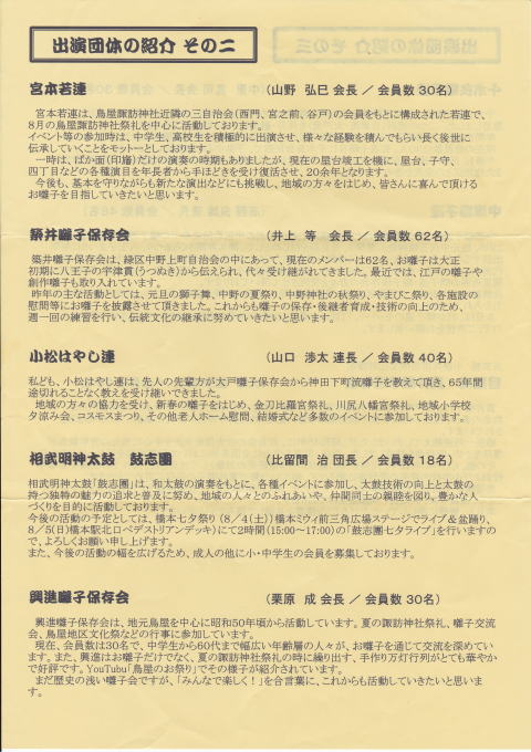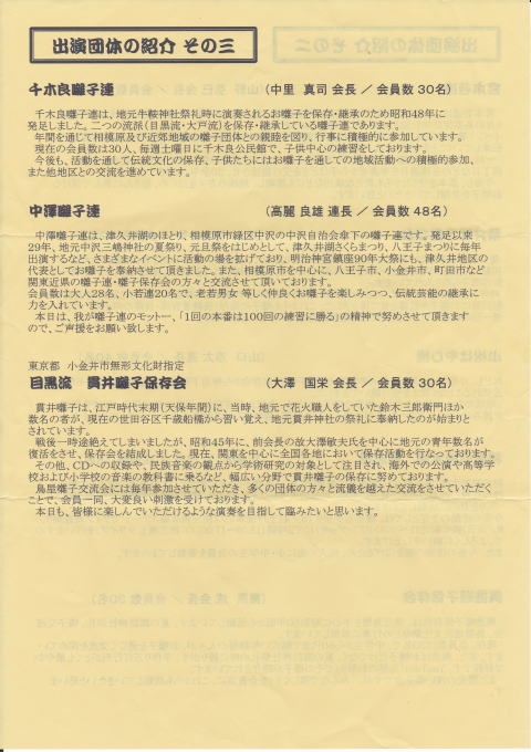 12団体の競演により、充実した一日となりました。 ご来場いただいた一般来場の皆様も、盛り上げていただき、ありがとうございました。 鳥屋囃子交流会 実行委員の皆様、競演した各団体の皆様、 お世話になりました。ありがとうございました。 |