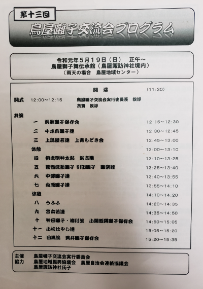 5月19日(日)、鳥屋獅子舞伝承館(鳥屋諏訪神社境内)にて鳥屋囃子交流会が行われました。