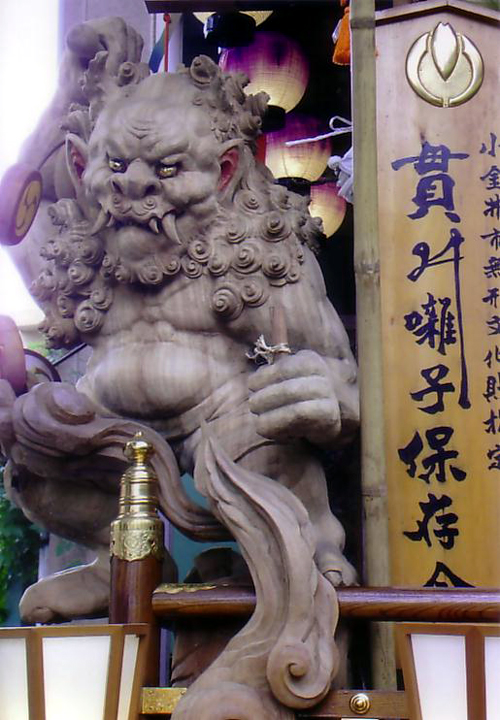 山車の正面左側に位置する雷神は、太鼓を負い手にばちを持って