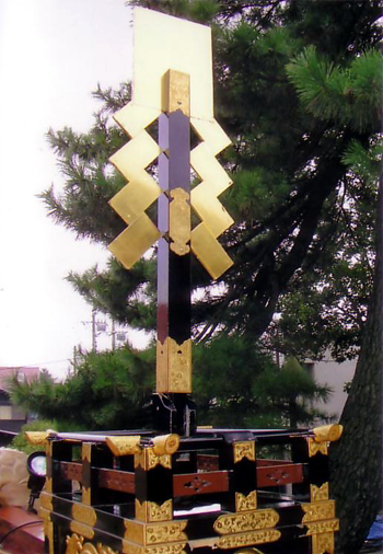 金色の幣束(へいそく)。1mほどの高さで山車の屋根部