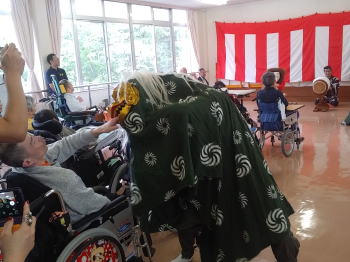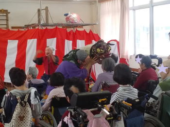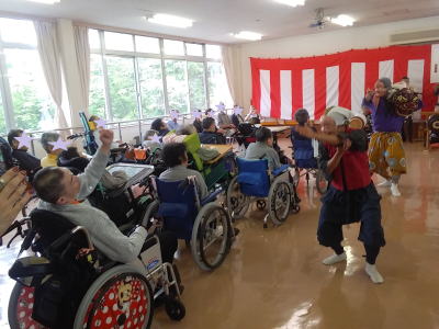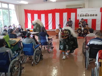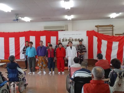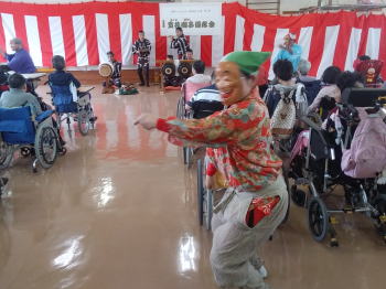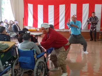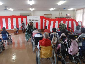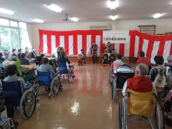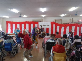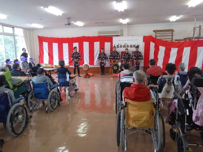 | センターに到着し、皆様に温かく迎えていただきました。 そしてお囃子を披露させていただきました。 ![]() 私たちのために看板や紅白幕で部屋を飾り、舞台を準備していただきました! |