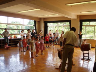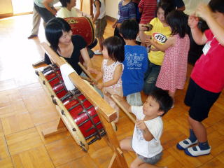 | 貫井囃子こども教室では、太鼓の叩き方、踊り方といった技術的なことの前に、礼儀を教えるようにしています。まず子供達に最初に覚えてもらうのは挨拶です。最初は恥ずかしくて言えなかった子も、2,3回目の練習からは「こんにちは!」と元気よく挨拶をして集まってくるようになります。 子供達の変化は練習のとき以外にもみられるようです。父母の方々からは『普段も挨拶が出来るようになった。』『落ち着きがでて、しっかりしてきた。』『引っ込み思案の子だったのに、うちに帰ってくると今日はこんなの習ったよ、と一生懸命私に教えてくれるんです。』といった嬉しい報告がありました。付き添いで練習に来ている父母の方々も子供と一緒に習い、家でもお囃子の話をすることで、さらにコミュニケーションが深まることもあるようです。 回数をおうごとに、子供達はお父さんやお母さんのそばから離れて練習が出来るようになり、積極的になっていくのが分かりました。さらに、前回に続いて参加した子が中心となって、子供同士で太鼓を叩いたりするなど、チームワークも出てきました。発表会までの回数が前回と比べて少なく、子供達がどこまで覚えられるか心配でしたが、発表会では私達が驚くほど、みんなしっかりと、そして堂々と太鼓の演奏と踊りを披露しました。 |
