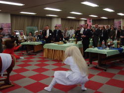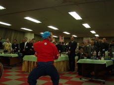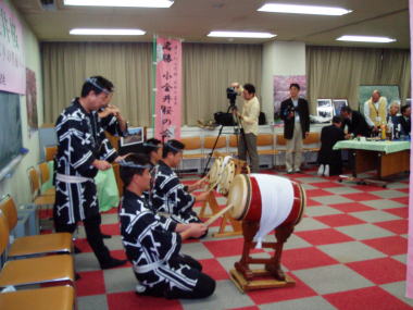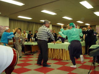 始めは、貫井囃子を見たことも聞いたこともない北上の方々の表情は硬く、真剣に見ているだけでしたが、仁羽になり、ひょっとこが出てくると、次第に笑顔になっていきました。そして、ひょっとこに合わせて踊りだし、誘われるままお面をつけて踊りました。ひとり、ふたり・・・とどんどん踊りだし、またその踊りをみて、会場には笑いと手拍子が起き、大変盛り上がりました!