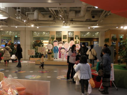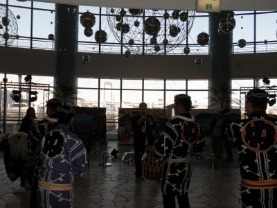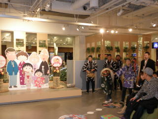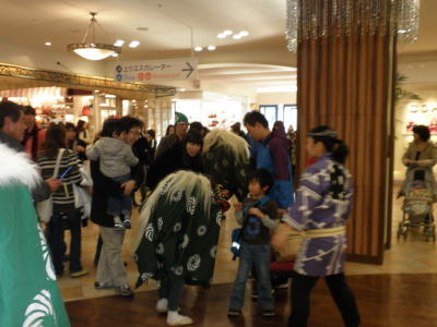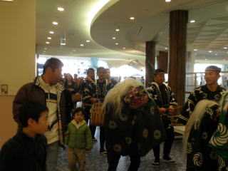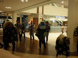 | アクアシティお台場6階にあるキッズカフェママトコで出演してきました。ママトコ内では、お正月企画として昔なつかしの遊び(スゴロクや福笑い)やコマ体験などが開催されていました。私たちは午後1時半と3時の2回、ママトコ内を獅子舞で廻ったあと、3階の出入り口付近や店内を練り歩きました。 |