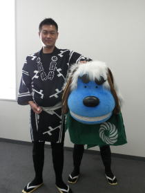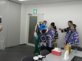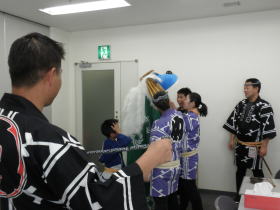 | 今回は、お囃子の獅子舞のほか、フジテレビキャラクターのラフ君の獅子舞(ラフ舞)も出してほしいとのこと・・・普通の獅子舞しか見たことのない私達は、控え室でラフ舞に興味津々(笑)想像していたより大きく、口もちゃんと開き、獅子舞と同じ構造でできていることに驚きました。記念撮影したり、みんなして交代でかぶってみたり、のぞいてみたり、お客さんに見せる前に、はしゃぐメンバー達(^^) |