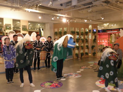 | ママトコ内では頭を噛まれるとき大泣きしてしまう子どもが多かったのですが、3階店内では獅子舞もラフ舞も、子どもから大人にまで大人気!頭を獅子に噛んでもらったり、記念撮影をしたり、多くの人が集まってきました。 |