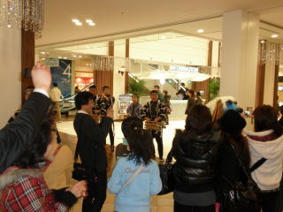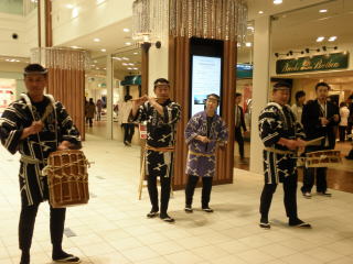 | 午後1時半、一回目の出演です。店内を練り歩くということで、桶胴という担いで叩く太鼓で演奏しました。 |