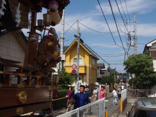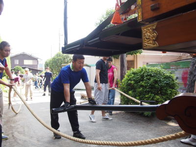 夜の宵宮に向けて山車を飾り付け、山車小屋から移動します。