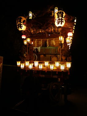 たくさんの提灯の灯りとともに、山車が近づいてくる景色がキレイです。