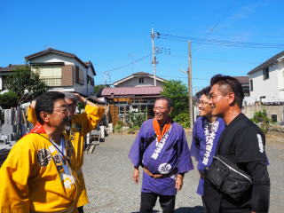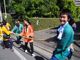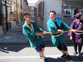 山車の先頭の綱持ちは、大変! でも笑顔で引いてくれています!