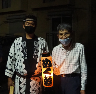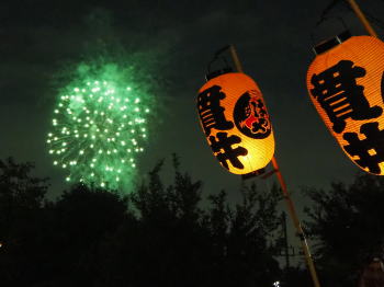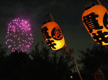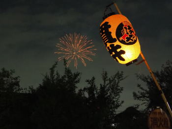 会長と高張提灯と花火