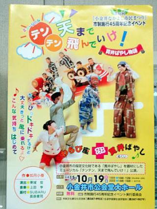 第31回「小金井なかよし市民まつり」市制施行45周年記念イベント(平成15年10月19日/主催:市制施行45周年記念イベント実行委員会)では、貫井囃子保存会も出演し創作ミュージカルと本物のお囃子の両方が楽しめる公演となりました。