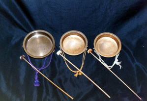 全体の配置のなかでは、正面に向かって左後方に位置し、胸の前に持った鉦を上下左右に振り、からだ全体でリズムをとりながら演奏します。また、鉦の裏側を二本または三本の指で押さえたり離したりしながら、竹または鯨のヒゲの先に鹿角を付けた棒で叩きます。